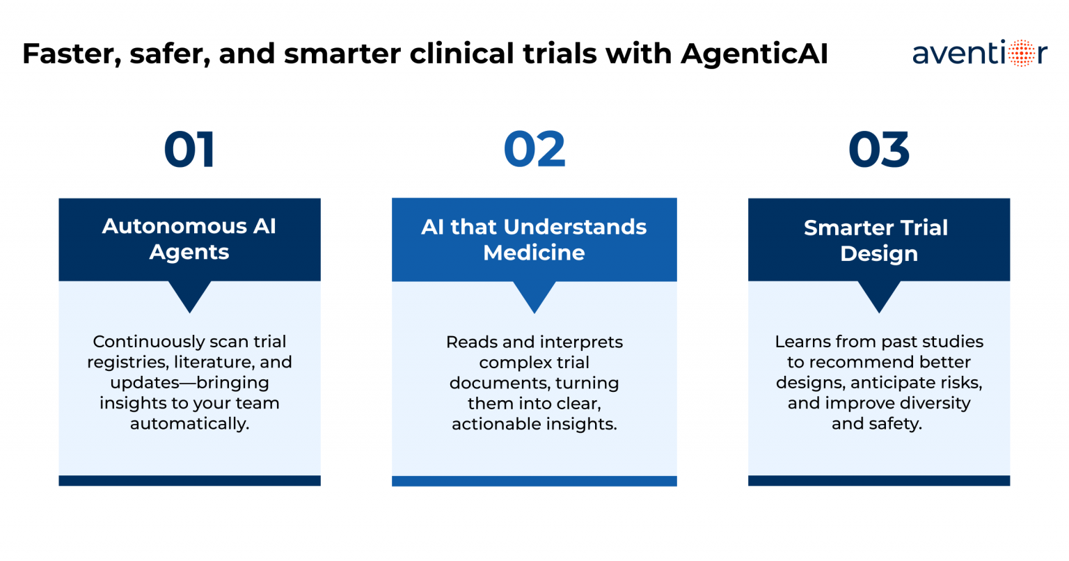 Aventior created an AgenticAI platform that turns scattered trial data into a single, consistent source of truth. The platform automatically reads and organizes information from trial documents, making it searchable and easy to understand. It helps teams design protocols more effectively by simplifying eligibility criteria, refining endpoints, and optimizing visit schedules. Sites and investigators are automatically compared and ranked based on past performance, capacity, and diversity coverage, making it easier to choose the right partners. The system also keeps track of registry updates in real time, flags risks early, and supports compliance by keeping humans in the loop for oversight. In short, the solution cuts through complexity and transforms trial operations into a faster, smarter, and more reliable process.